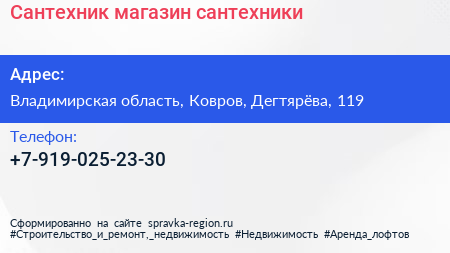 Сантехник, магазин сантехники по адресу Владимирская область, Ковров, Дегтярёва, 119 в дальнейшем Организация, размещена в следующих категориях: