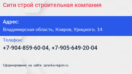 Сити-строй, строительная компания по адресу Владимирская область, Ковров, Урицкого, 14 в дальнейшем Организация, размещена в следующих категориях: