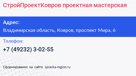 СтройПроектКовров, проектная мастерская по адресу Владимирская область, Ковров, проспект Мира, 6 в дальнейшем Организация, размещена в следующих категориях: