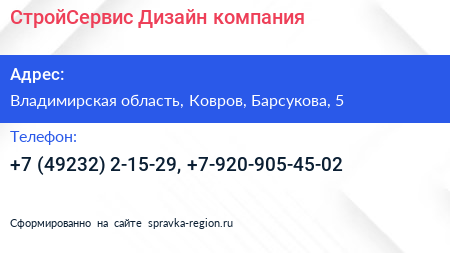СтройСервис Дизайн, компания по адресу Владимирская область, Ковров, Барсукова, 5 в дальнейшем Организация, размещена в следующих категориях: