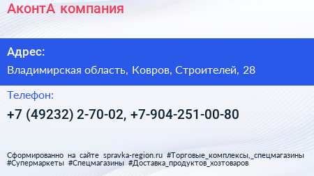 АконтА, компания по адресу Владимирская область, Ковров, Строителей, 28 в дальнейшем Организация, размещена в следующих категориях: