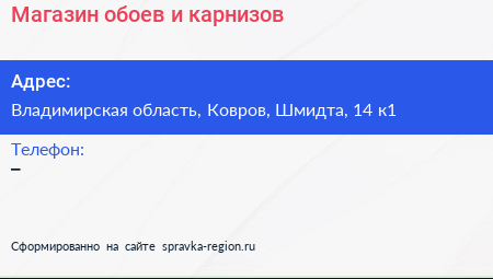 Магазин обоев и карнизов по адресу Владимирская область, Ковров, Шмидта, 14 к1 в дальнейшем Организация, размещена в следующих категориях: