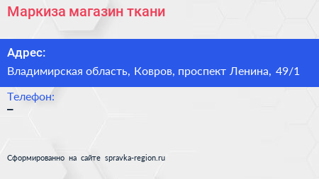 Маркиза, магазин ткани по адресу Владимирская область, Ковров, проспект Ленина, 49/1 в дальнейшем Организация, размещена в следующих категориях: