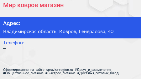 Мир ковров, магазин по адресу Владимирская область, Ковров, Генералова, 40 в дальнейшем Организация, размещена в следующих категориях: