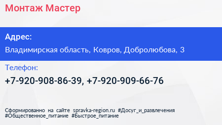 Монтаж Мастер по адресу Владимирская область, Ковров, Добролюбова, 3 в дальнейшем Организация, размещена в следующих категориях:
