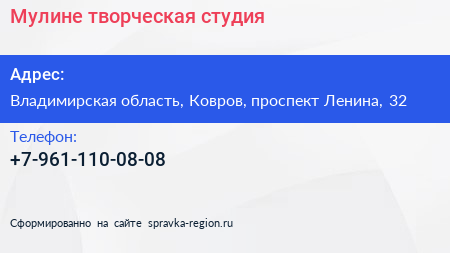 Мулине, творческая студия по адресу Владимирская область, Ковров, проспект Ленина, 32 в дальнейшем Организация, размещена в следующих категориях:
