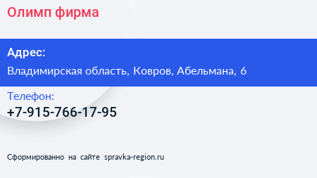 Олимп, фирма по адресу Владимирская область, Ковров, Абельмана, 6 в дальнейшем Организация, размещена в следующих категориях: