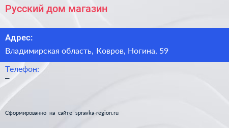 Русский дом, магазин по адресу Владимирская область, Ковров, Ногина, 59 в дальнейшем Организация, размещена в следующих категориях: