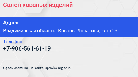 Салон кованых изделий по адресу Владимирская область, Ковров, Лопатина, 5 ст16 в дальнейшем Организация, размещена в следующих категориях: