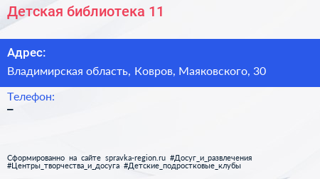Детская библиотека №11 по адресу Владимирская область, Ковров, Маяковского, 30 в дальнейшем Организация, размещена в следующих категориях:
