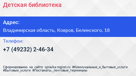 Детская библиотека по адресу Владимирская область, Ковров, Белинского, 18 в дальнейшем Организация, размещена в следующих категориях: