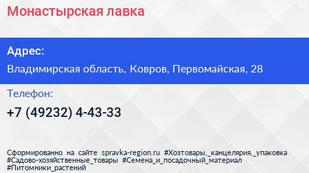 Монастырская лавка по адресу Владимирская область, Ковров, Первомайская, 28 в дальнейшем Организация, размещена в следующих категориях: