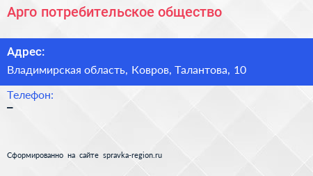 Арго, потребительское общество по адресу Владимирская область, Ковров, Талантова, 10 в дальнейшем Организация, размещена в следующих категориях: