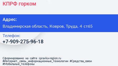 КПРФ, горком по адресу Владимирская область, Ковров, Труда, 4 ст65 в дальнейшем Организация, размещена в следующих категориях: