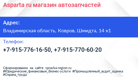 Asparta.ru, магазин автозапчастей по адресу Владимирская область, Ковров, Шмидта, 14 к1 в дальнейшем Организация, размещена в следующих категориях: