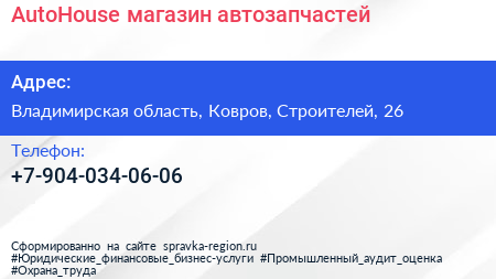AutoHouse, магазин автозапчастей по адресу Владимирская область, Ковров, Строителей, 26 в дальнейшем Организация, размещена в следующих категориях: