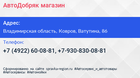 АвтоДобряк, магазин по адресу Владимирская область, Ковров, Ватутина, 86 в дальнейшем Организация, размещена в следующих категориях: