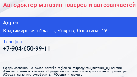 Автодоктор, магазин товаров и автозапчастей по адресу Владимирская область, Ковров, Лопатина, 19 в дальнейшем Организация, размещена в следующих категориях: