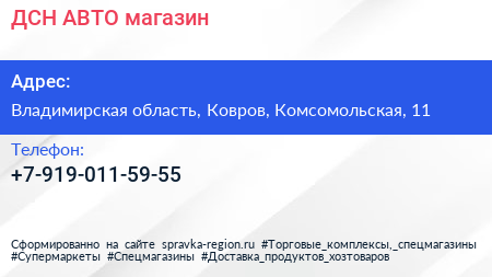 ДСН АВТО, магазин по адресу Владимирская область, Ковров, Комсомольская, 11 в дальнейшем Организация, размещена в следующих категориях: