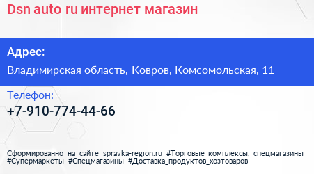 Dsn-auto.ru, интернет-магазин по адресу Владимирская область, Ковров, Комсомольская, 11 в дальнейшем Организация, размещена в следующих категориях: