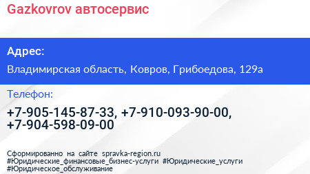 Gazkovrov, автосервис по адресу Владимирская область, Ковров, Грибоедова, 129а в дальнейшем Организация, размещена в следующих категориях: