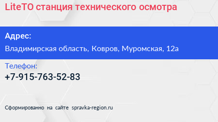 LiteTO, станция технического осмотра по адресу Владимирская область, Ковров, Муромская, 12а в дальнейшем Организация, размещена в следующих категориях:
