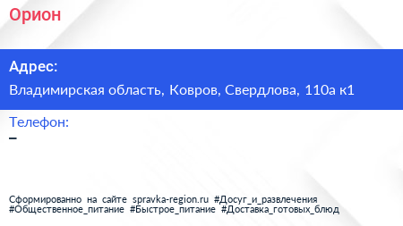 Орион по адресу Владимирская область, Ковров, Свердлова, 110а к1 в дальнейшем Организация, размещена в следующих категориях: