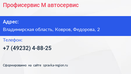 Профисервис-М, автосервис по адресу Владимирская область, Ковров, Федорова, 2 в дальнейшем Организация, размещена в следующих категориях: