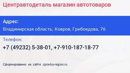 Центравтодеталь, магазин автотоваров по адресу Владимирская область, Ковров, Грибоедова, 76 в дальнейшем Организация, размещена в следующих категориях: