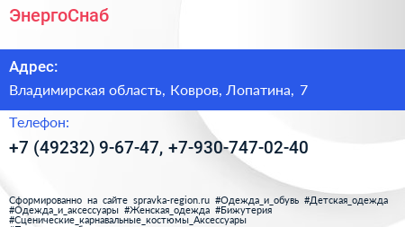 ЭнергоСнаб по адресу Владимирская область, Ковров, Лопатина, 7 в дальнейшем Организация, размещена в следующих категориях: