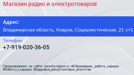 Магазин радио и электротоваров по адресу Владимирская область, Ковров, Социалистическая, 21 ст1 в дальнейшем Организация, размещена в следующих категориях: