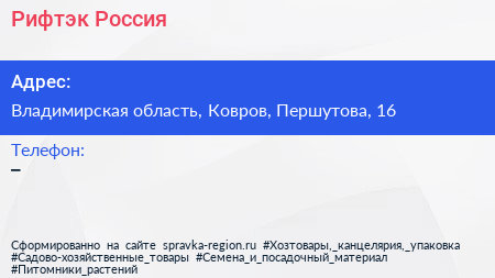 Рифтэк Россия по адресу Владимирская область, Ковров, Першутова, 16 в дальнейшем Организация, размещена в следующих категориях: