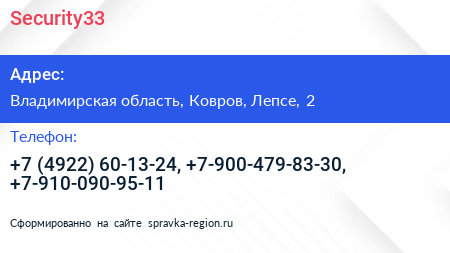 Security33 по адресу Владимирская область, Ковров, Лепсе, 2 в дальнейшем Организация, размещена в следующих категориях: