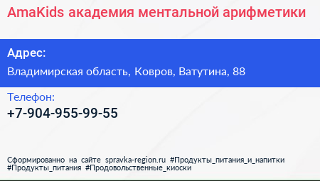 AmaKids, академия ментальной арифметики по адресу Владимирская область, Ковров, Ватутина, 88 в дальнейшем Организация, размещена в следующих категориях:
