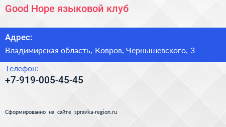 Good Hope, языковой клуб по адресу Владимирская область, Ковров, Чернышевского, 3 в дальнейшем Организация, размещена в следующих категориях: