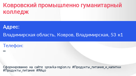 Ковровский промышленно-гуманитарный колледж по адресу Владимирская область, Ковров, Владимирская, 53 к1 в дальнейшем Организация, размещена в следующих категориях: