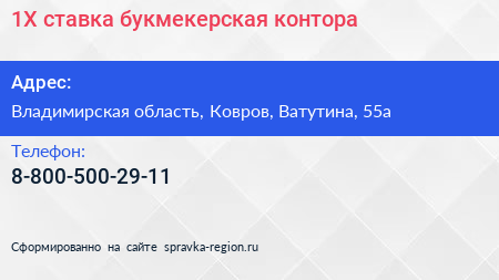 1Х ставка, букмекерская контора по адресу Владимирская область, Ковров, Ватутина, 55а в дальнейшем Организация, размещена в следующих категориях: