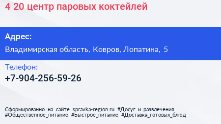 4:20, центр паровых коктейлей по адресу Владимирская область, Ковров, Лопатина, 5 в дальнейшем Организация, размещена в следующих категориях:
