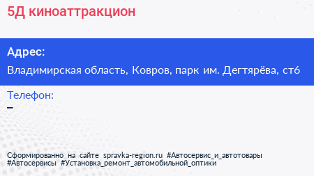 5Д-киноаттракцион по адресу Владимирская область, Ковров, парк им. Дегтярёва, ст6 в дальнейшем Организация, размещена в следующих категориях: