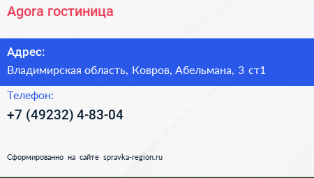 Agora, гостиница по адресу Владимирская область, Ковров, Абельмана, 3 ст1 в дальнейшем Организация, размещена в следующих категориях: