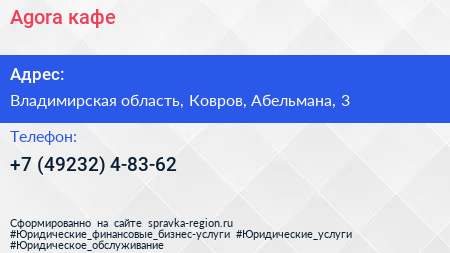 Agora, кафе по адресу Владимирская область, Ковров, Абельмана, 3 в дальнейшем Организация, размещена в следующих категориях:
