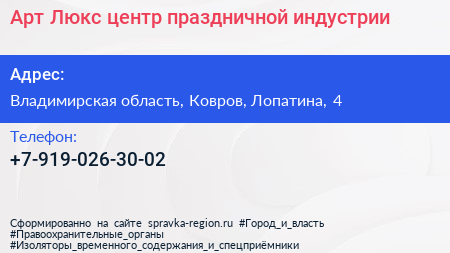 Арт-Люкс, центр праздничной индустрии по адресу Владимирская область, Ковров, Лопатина, 4 в дальнейшем Организация, размещена в следующих категориях: