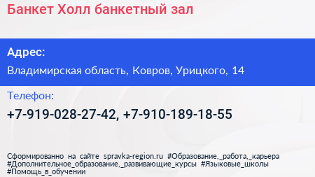Банкет Холл, банкетный зал по адресу Владимирская область, Ковров, Урицкого, 14 в дальнейшем Организация, размещена в следующих категориях:
