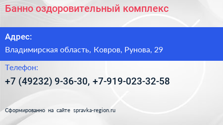Банно-оздоровительный комплекс по адресу Владимирская область, Ковров, Рунова, 29 в дальнейшем Организация, размещена в следующих категориях:
