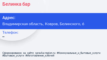 Белинка, бар по адресу Владимирская область, Ковров, Белинского, 6 в дальнейшем Организация, размещена в следующих категориях: