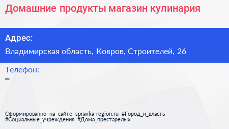 Домашние продукты, магазин-кулинария по адресу Владимирская область, Ковров, Строителей, 26 в дальнейшем Организация, размещена в следующих категориях:
