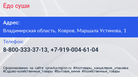 Ёдо суши по адресу Владимирская область, Ковров, Маршала Устинова, 1 в дальнейшем Организация, размещена в следующих категориях: