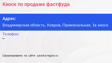 Киоск по продаже фастфуда по адресу Владимирская область, Ковров, Привокзальная, 1в киоск в дальнейшем Организация, размещена в следующих категориях: