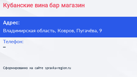 Кубанские вина, бар-магазин по адресу Владимирская область, Ковров, Пугачёва, 9 в дальнейшем Организация, размещена в следующих категориях:
