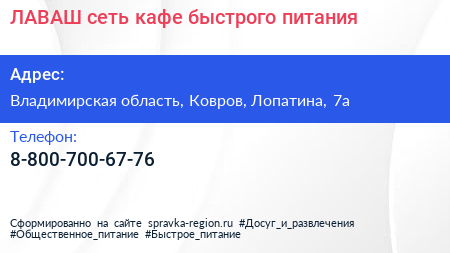 #ЛАВАШ, сеть кафе быстрого питания по адресу Владимирская область, Ковров, Лопатина, 7а в дальнейшем Организация, размещена в следующих категориях:
